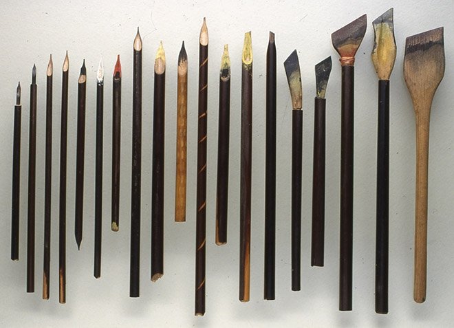 Заостренный конец каляма назывался «языком». Его расщепляли на две части, чтобы образовался желобок, выполняющий роль своего рода резервуара для чернил и обеспечивающий непрерывный сток чернил во время письма.