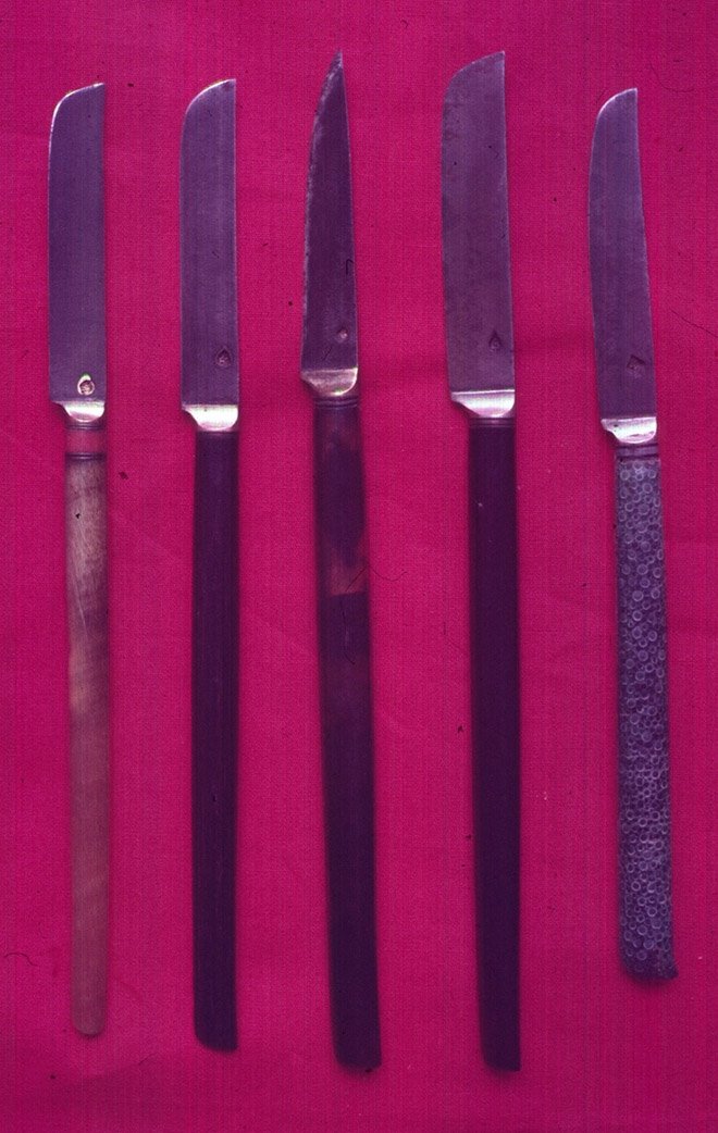 Перочинные ножи меньших размеров использовались для исправления надписей на бумаге, покрытой ахаром. Ахар – это специальная смесь из квасцов и яичного белка, которой покрывали бумагу для блеска.